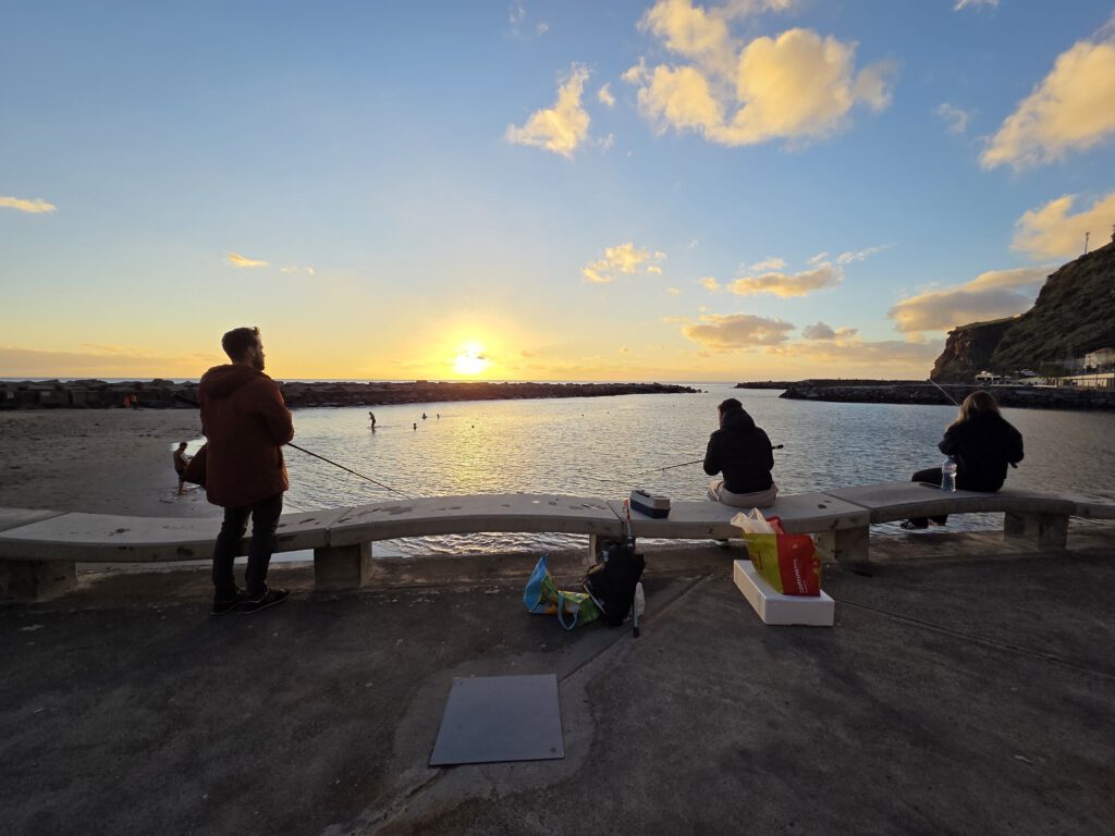 Zum Abendessen fahren wir dann durch nach Calheta, endlich ist die Küstenstraße nicht mehr gesperrt! Im Sonnenuntergang beobachten wir Schwimmer, Angler, Jogger und haben schließlich die Qual der Wahl zwischen den vielen Restaurants an der Uferpromenade. Wir landen in einem Italiener, der schließlich die bestbesuchte Einkehr im Ort ist. Immerhin 15.000 Schritte, da ist die Pizza verdient.