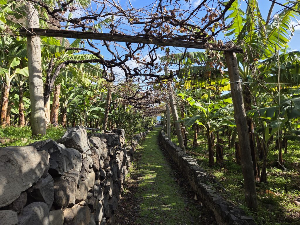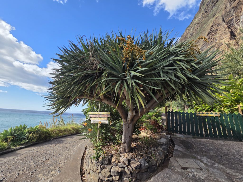 Dazu müssen wir wieder 30 Minuten an der Küste entlang Richtung Funchal fahren. Dann gibt es eine kleine, sehr steile Seilbahn an der Küste, die zu Faja dos Padros führt. Aber die Reiseleitung führt erstmal ein ausführliches Gespräch - natürlich wurde das alles am Vormittag digital gebucht, aber die Mailbestätigung kam irgendwie nicht. Wie gut, dass Nicole sich angewöhnt hat, sich selbst stets einen Screenshot zu schicken. Die Fachfrau ist erstaunt, dass wir etwas gebucht haben, schließlich ist sie ja für die Führungen zuständig. Aber irgendwo findet sich dann die Buchung und wir bekommen sogar eine exklusive Führung nur für uns vier. Allerdings dauert die Vorbereitung noch ein paar Minuten, da sie noch ein paar Früchte sammeln muss.