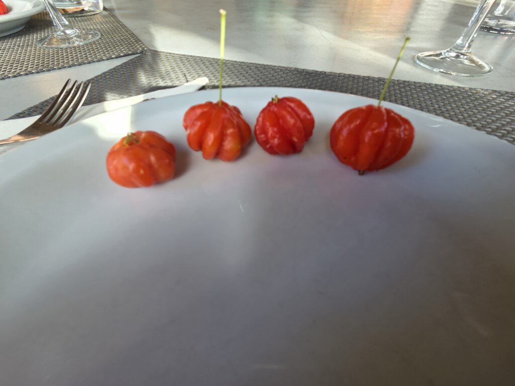Nun gibt es eine Biolandwirtschaft, ein paar Ferienhäuschen (teuer) und ein Restaurant (leider nur bis 15 Uhr warme Küche). Viele Badegäste zahlen auch gerne die 12 Euro pro Person für die Seilbahn, um dort am Strand zu liegen. Selbst heute. Wir bekommen zunächst eine Führung über das Gelände - es gibt zahlreiche unterschiedliche Sorten Mango und Avocado, natürlich Papaya, Bananen über Bananen, die Pitanga-Frucht (auch: Surinam Kirsche), Guaven, etc etc.