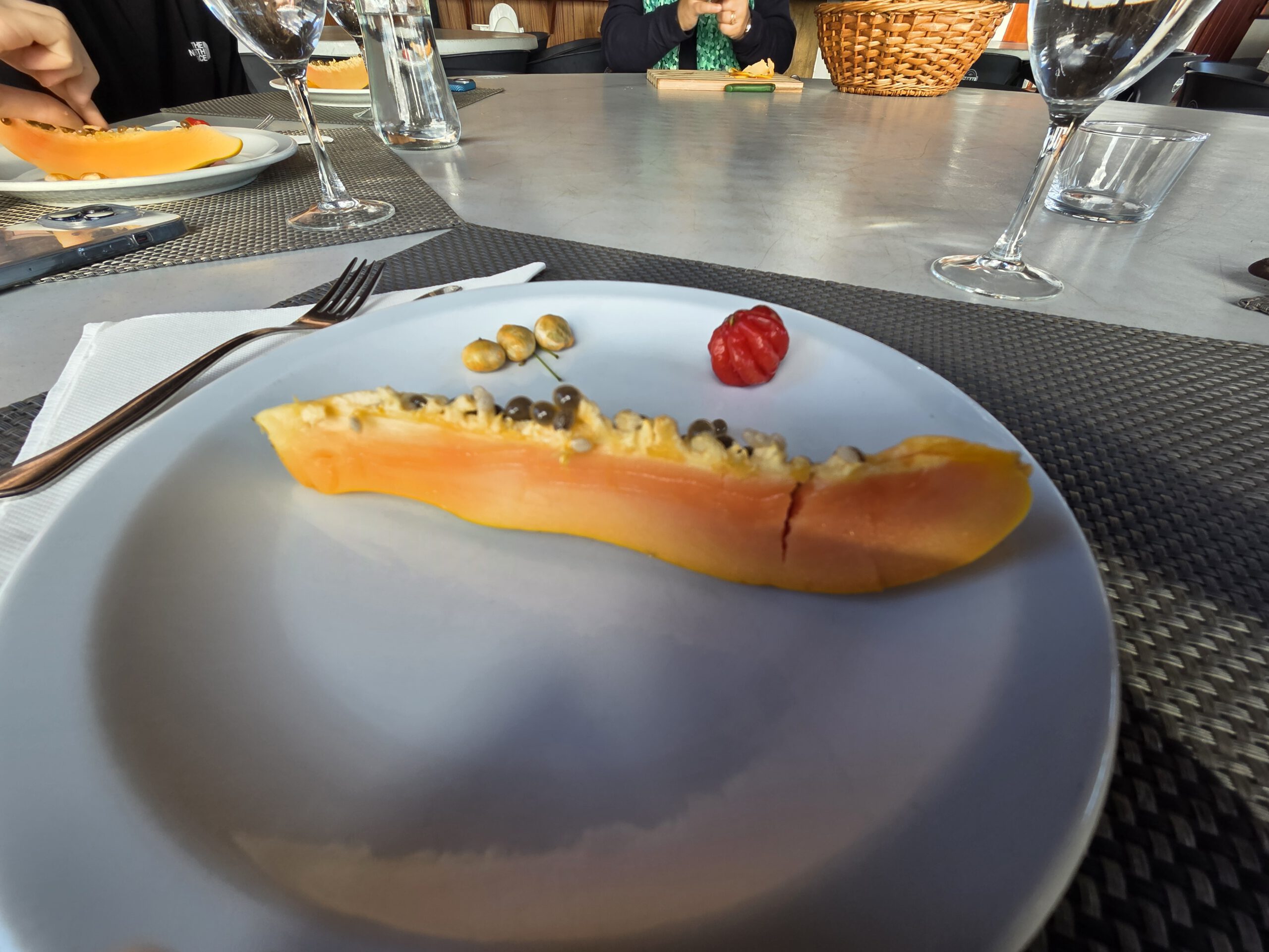 Beim Tasting selbst gibt es dann Pitangas in unterschiedlichen Reifegraden, die sehr faszinierend, lecker und tatsächlich auch unterschiedlich schmecken. Papaya, eine Avocado, die ganz anders ist, als die deutsche Supermarktware (natürlich besser), und Guaven. Und mangels reifer Mangos und Maracujas - gerade keine Saison - bekommen wir Avocado/Bananen/Pitanga und Guaven-Eis. Sehr fein.