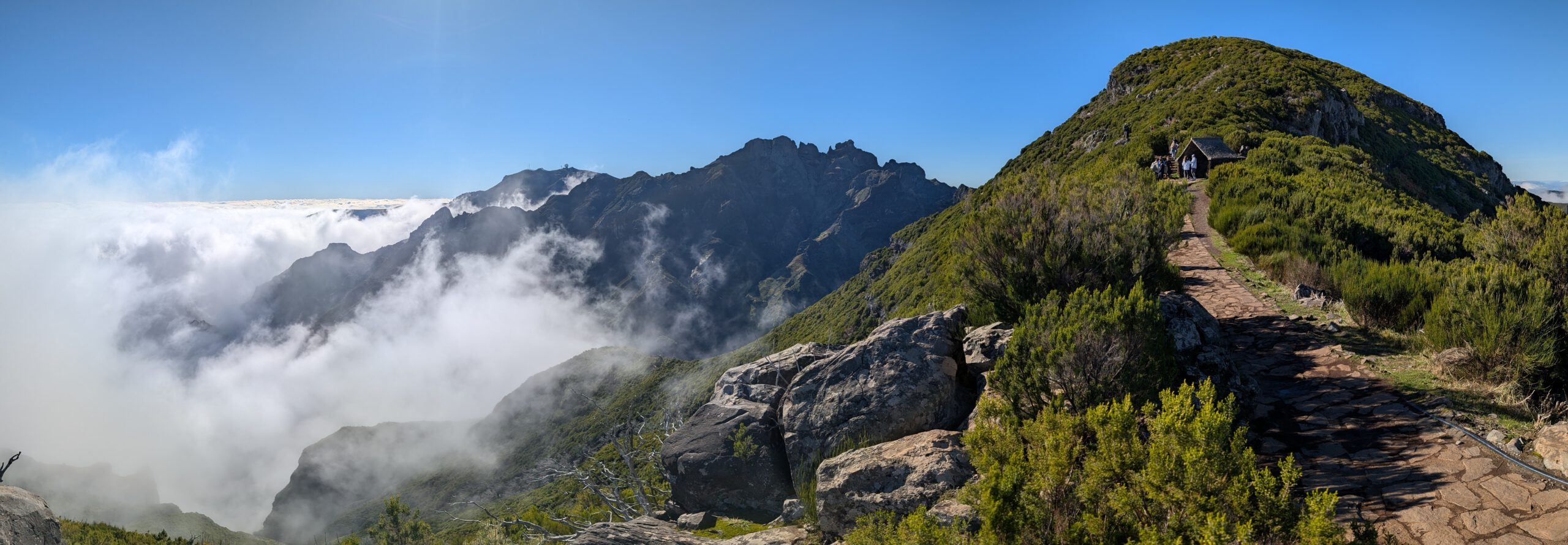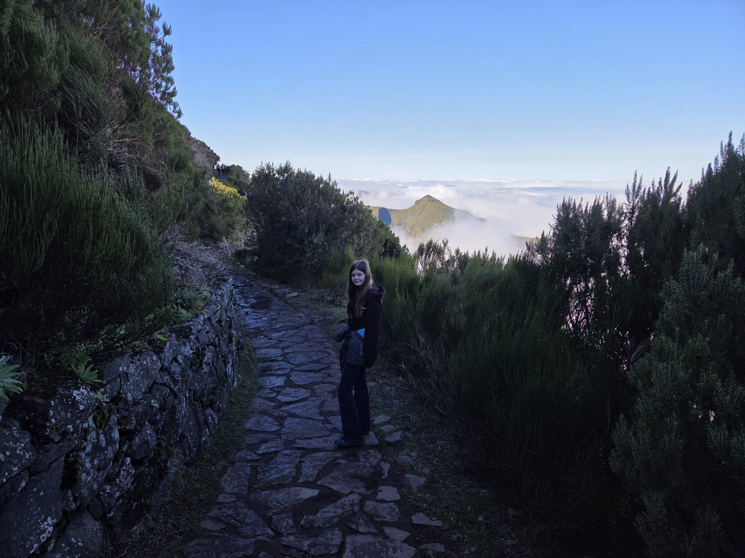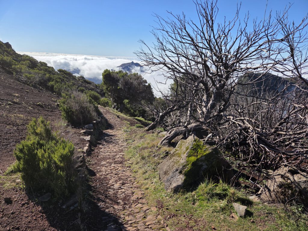 Der Weg ist nur 2,8 Kilometer lang, allerdings sind 400 Höhenmeter zu überwinden. Es ist viel los: Ein - vor allem deutsch-portugiesischer - Ameisentrail führt stetig bergan. Stellenweise künden eisige Stellen noch von einer kalten Bergnacht. Und nachdem auf der Fahrt nach oben noch dicke Wolken die Sicht verdeckten, reißt es jetzt auf: Wir sind über den Wolken, zeitweise gibt es sogar Sicht auf den Pico de Arieiro. Das Panorama ist sagenhaft und die Fotostopps eine gute Gelegenheit, zwischendurch mal tief Luft zu holen. A bisserl anstrengend ist der Aufstieg ja schon.