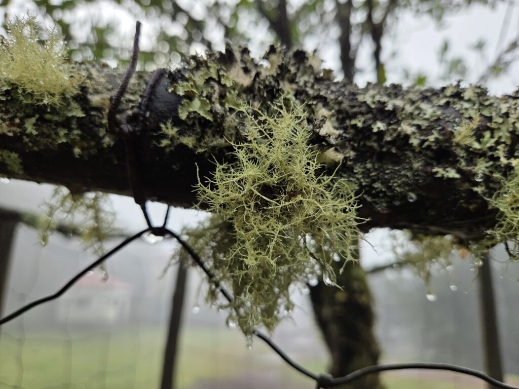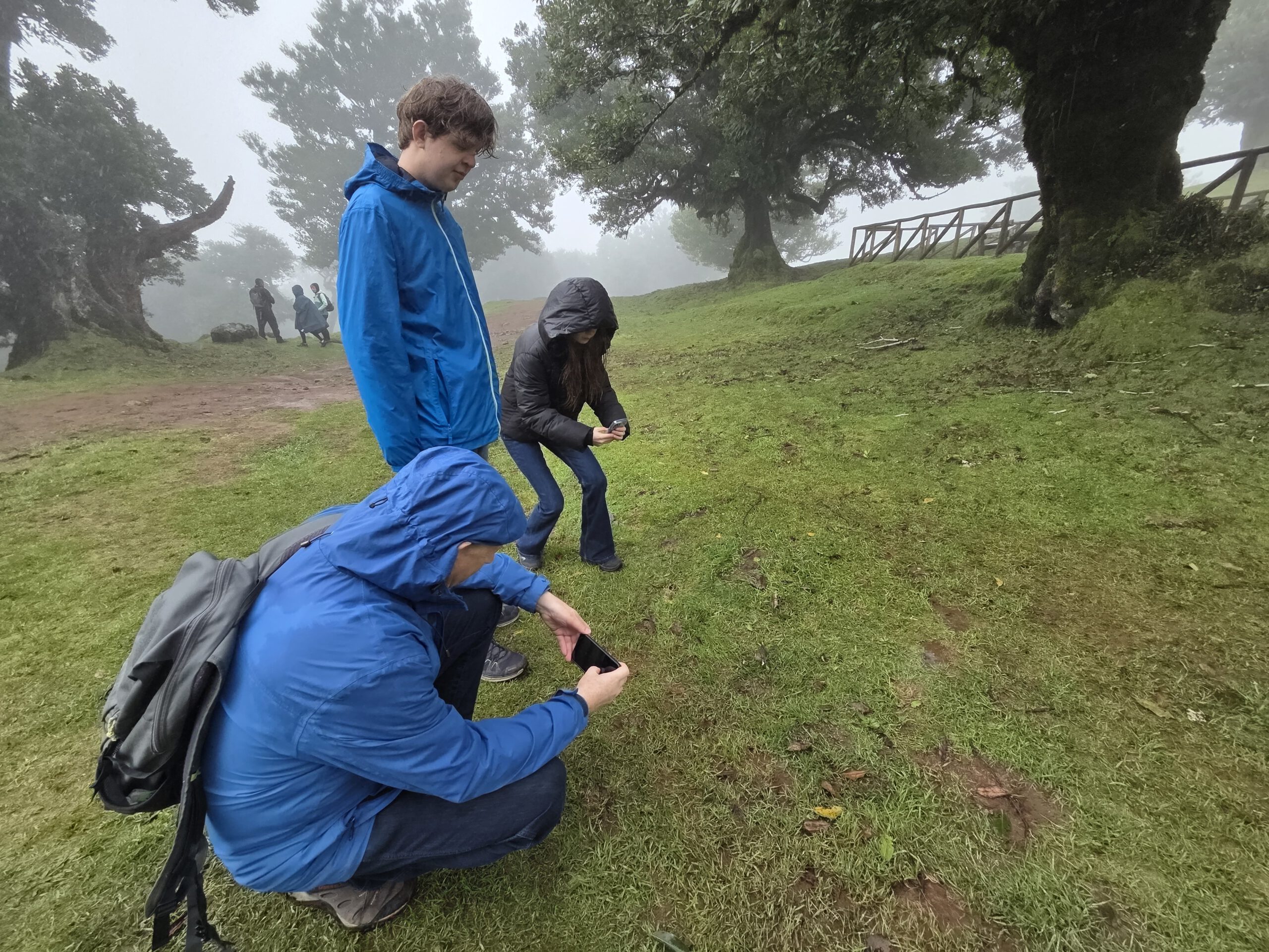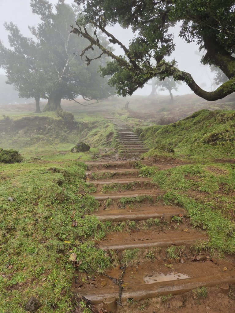 Am Anfang sind noch heitere Grüppchen unterwegs, immer wieder rutschen Wanderer im tiefen Matsch aus und landen im Schlamm. Wir schaffen es irgendwie, das zu vermeiden, auch wenn die Hosenbeine von Louisa und Nicole danach auch Spuren des Weges tragen. Aber dann wird es ruhiger, der Nebel bleibt dicht. Aber die Atmosphäre ist großartig und wir fotografieren sehr viele alte, knorrzige Bäume im Dunst. Wunderschöne Flechten hängen an den Ästen, Farne haben sich angesiedelt. Das gefällt uns sehr gut und hier gehört das Wetter ja ausnahmsweise auch mal hin. Gezahlt haben wir übrigens nix, gab ja keine Tafel mit QR-Code ... Aber alle Wege drumrum kosten natürlich.