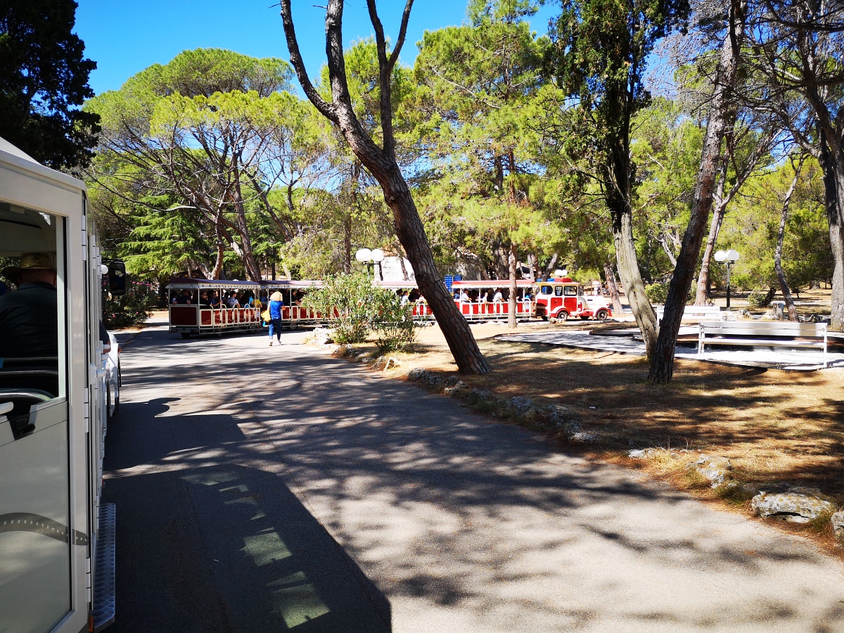 Als hätte sie es geahnt, hatte die Reiseleitung schon zu Beginn der Woche einen Ausflug zu den Brijuni-Inseln gebucht. Den gibt es ausschließlich in Verbindung mit einer Führung in einem kleinen Bähnchen. Die Reiseleitung findet, das geht auch mit dickem Knöchel, die restliche Reisegruppe ist eher skeptisch. Aber gebucht ist nunmal gebucht.
