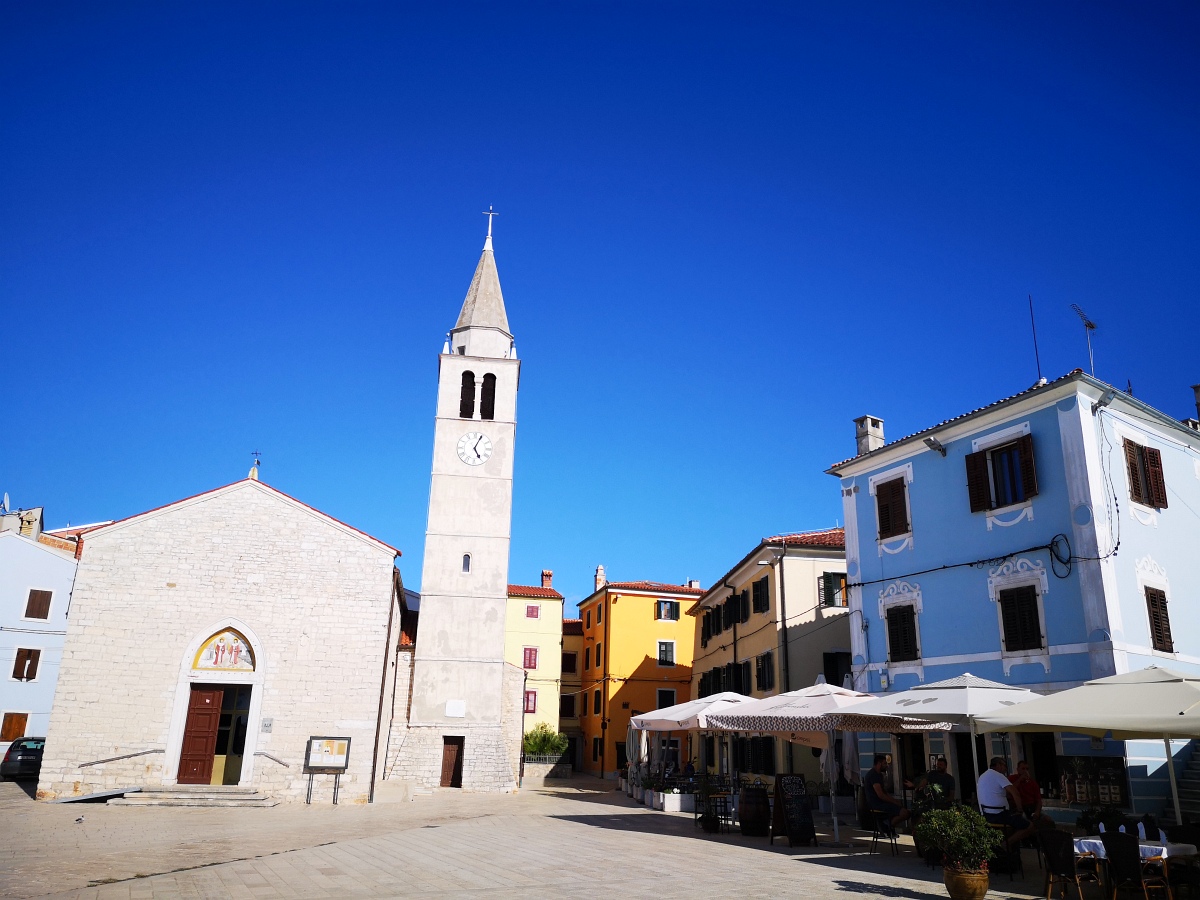 Medulin ist DER Touristenhotspot in Südistrien, was auch an den 70 Kilometern Küstenlinie liegt. Gerade ist das Örtchen aber sehr beschaulich, wenige Fußgänger sind unterwegs. Klar, die sitzen ja auch alle im Auto. Wir suchen einen alten Ortskern und stellen fest, dass es ihn nicht wirklich gibt. Es gibt die Kirche St. Agnes, auffällig, aber geschlossen. Und es gibt an einem kleinen, verwaisten Platz, die Kirche Maria Della Salute mit einem wunderschönen Kreuzgang aus Keramiktellern. Sagenhaft. Findet die Reiseleitung. Der Rest hat mal wieder nur Hunger.