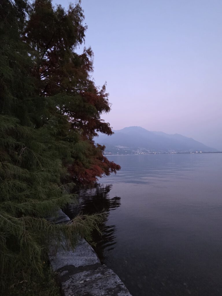 Wir fahren eine S-Bahn früher nach Mannheim und decken uns noch mit (schlechtem) Kaffee und Backwaren ein. Danach geht es erstaunlich (fast) pünktlich mit dem ICE nach Basel, von dort aus nochmal 4,5 Stunden in einem ziemlich leeren IR nach Locarno. Der Zug ist fast leer, der kleine Kaffeeautomat kann Leckeres zaubern und die Sicht ist natürlich grandios. Nach siebeneinhalb Stunden sind wir trotzdem froh angekommen zu sein. Im ICE wurden wir übrigens gar nicht kontrolliert, in der Schweiz hingegen gleich dreimal, mal mit einem fröhlichen Gruezi Miteinand, mal mit einem Buona Sera.