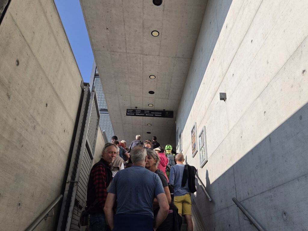 Diesmal sitzen wir in einem der Panoramazüge, die Sitze sind davon nicht breiter geworden. Dafür sind wir umzingelt von betagten Briten, die angesichts der Bergwelt aus dem Staunen nicht herauskommen und durchfilmen. Hier gäbe es sogar einen Servicewagen mit Kaffee, Bier und Aperol Spritz. Gibt es natürlich nicht, wir haben ja noch was vor.