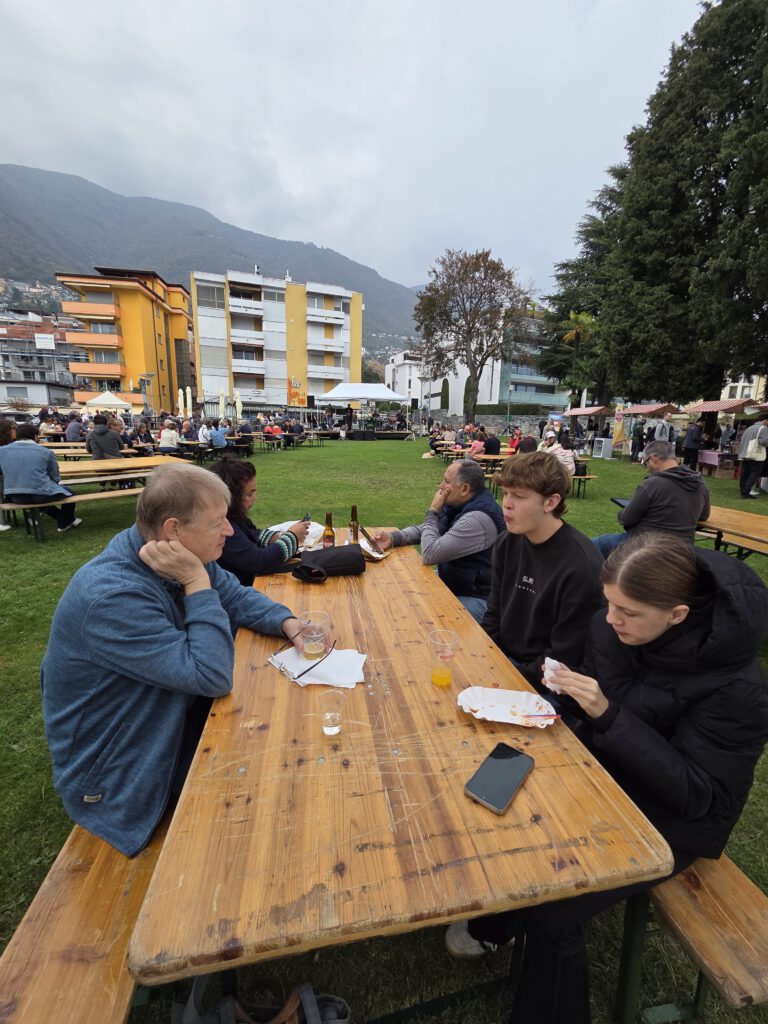 Als wir Richtung Seeufer bummeln hören wir erst einen Schlagersänger aufspielen. Doch dann wird es, quasi von einer kleinen Bühne aus als Konkurrenz, rockig: "Bier, Käse, Honig - am Meer". Viele Stände mit Honig und Käse, einige Stände mit lokalem Bier, zwei Stände mit Wein und ein Stand mit Streetfood aus Apulien, gefüllten Teigtaschen. Und da sind sie dann auch, die Locarner, viele davon gleich mit einer ganzen Flasche Rotwein auf dem Biertisch. Die Band rockt sich durch die größten Hits der letzten Jahrzehnte, manche Besucher tanzen sogar. Idealer Ort für eine kleine Mittagsrast.