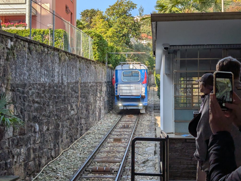 In den vergangenen Tagen war der Cimetta, der Hausberg von Locarno, immer in Dunst gehüllt. Morgen soll es regnen. Aber heute strahlte die Sonne schon seit dem frühen Morgen. (Und praktischerweise kann die Reiseleitung auch wieder schmerzfrei gehen). Also setzen wir den Plan um, den es seit Tag 1 hier gibt: Wir laufen zum kleinen blauen Bähnchen, das uns erstmal zur Wallfahrtskirche Madonna del Sasso bringt. An der Talstation kann man mit Karte zahlen. Während wir Schlange stehen, buchen wir noch schnell die Tickets online für die Seilbahn weiter oben - unterschiedliche Firmen, unterschiedliche Warteschlangen. Aber das klappt ganz gut.